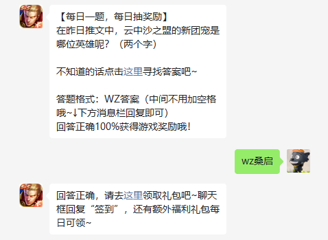 5 、加入了暃 、还有最后一位英雄也将在不久后到来,兰陵王的漫漫旅途,云中沙之盟的新团宠是桑启英雄的,而在S27萤火不灭全新赛季里,因此王者荣耀4月11日每日一题答案就是“wz桑启”,